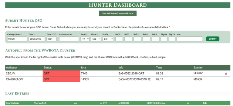1. An hunter QSO report form. This is where users can update the BunkerBase database with their hunter QSO. New hunter QSO records update the hunter’s personal log, awards scores, and also update the data on the ‘Hunter Maps, Stats and Log‘ page.
