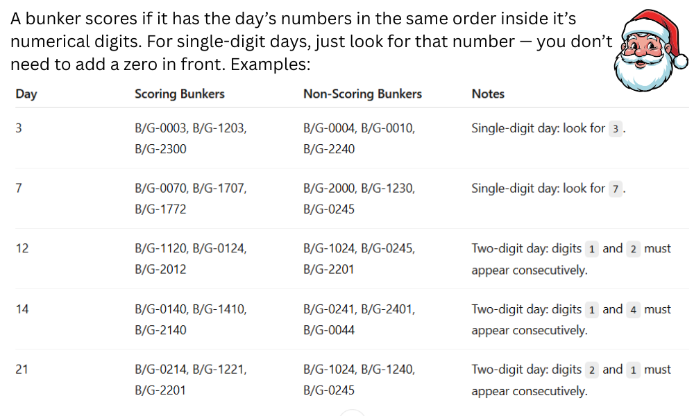 Note this map changes daily depending on the day of the event, read below for an explanation. Scoring bunkers for each day can be determined by clicking the appropriate day on the Advent Calendar (top right of the map container). Scoring bunkers for the selected day will be shown with a Santa icon. If you have geolocation active on your device the map will show a Christmas Tree marker at your location. The map also has a full-screen toggle and an ability to toggle the calendar on/off for those with small/mobile screens. Click on a Santa icon for more information about the bunker.