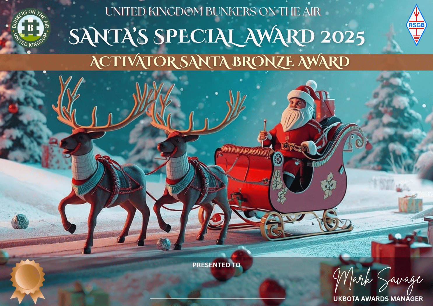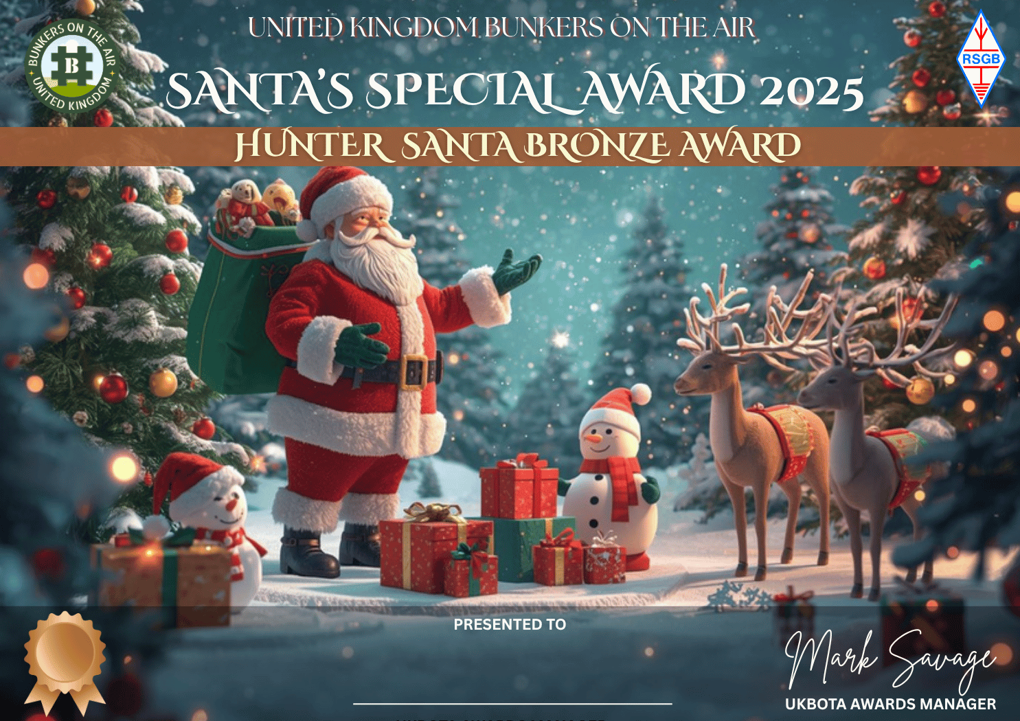 The Santa Special Award. This award is an accumulator. The idea is a total of the number of scoring bunkers you worked each day of the event. The award level for each of Activators and Hunters is: