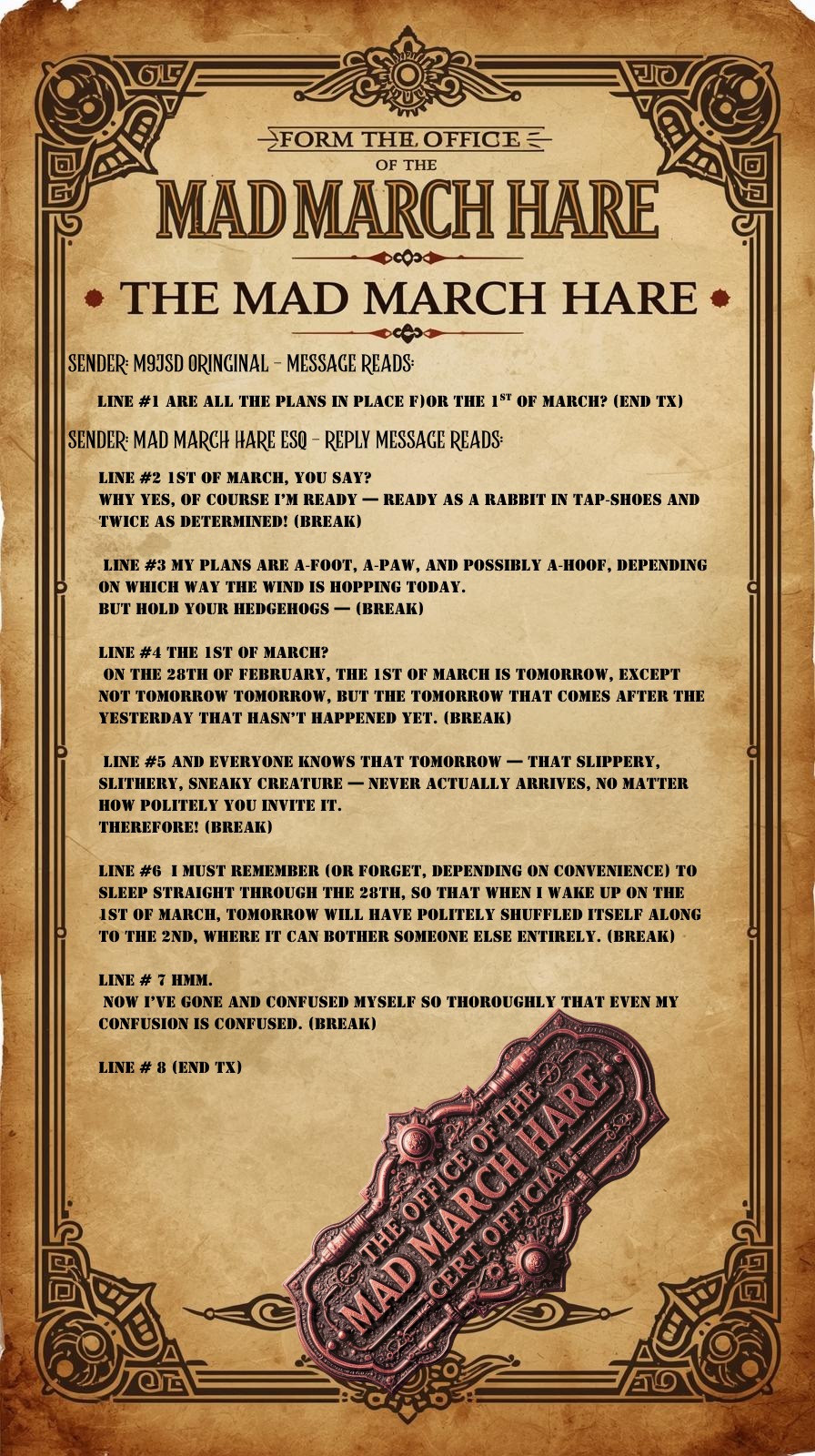 If by now you think this all sounds wonderfully confusing and weird — perfect, the hare will be absolutely thrilled! Should events tumble into chaos or generally defy all sense, the hare is entirely, unquestionably, and gleefully to blame.