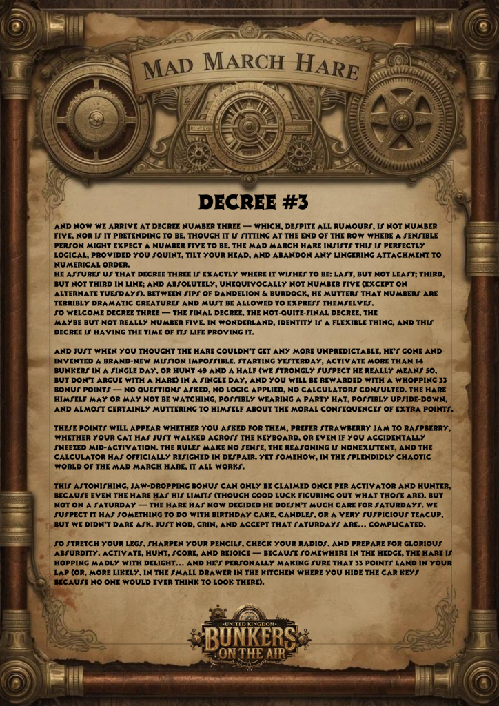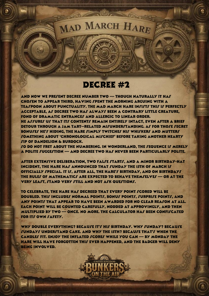 At completely unpredictable moments (and quite possibly during a heated argument with his own reflection), this mildly mal-adjusted mammal may suddenly announce a random and utterly ridiculous bonus. Will it be for activators? Hunters? Or perhaps in honour of his current favourite sandwich filling (which changes hourly)? Frankly… nobody knows. Least of all the hare. As his trusted friend the badger confirmed, shaking his head and hiding the cutlery, “There’s something not quite right with that hare.”
