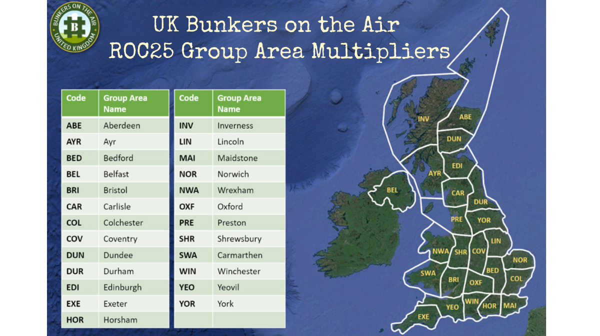 Valid bunkers for the ROC25 event are a subset of the UKBOTA Reference list. Only Royal Observer Corps HQ and Post references are valid for the ROC25 award.